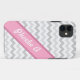 Stylish and girly chevron iPhone 5 case designed with a pattern of 2 shades of gray and white zigzags, and personalized with your name or custom text diagonally in white over a pink stripe.