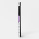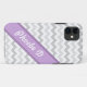 Stylish and girly chevron iPhone 5 case designed with a pattern of 2 shades of gray and white zigzags, and personalized with your name or custom text diagonally in white over a purple stripe.