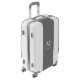 Available in a black, white or silver exterior, this luggage is shown with a white exterior. It features a custom white monogram and name on a gray background. Click Personalize this Template to easily personalize this luggage