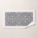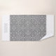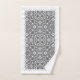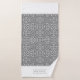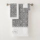 Gray damask pattern with white scalloped borders Bath Towel Set. The bath towel features an elegant gray and white damask pattern and white bands on the short sides with scalloped edges. There is also a frame with your family name. The hand towel showcases a scalloped border around it while the whash cloth is white in the center with a damask border and your monogram. You can personalize it with your family name and monogram.