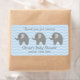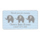 Cute grey elephant baby shower water bottle stickers. Custom babyshower water bottle labels with zoo animal design and chevron pattern background. Personalized elegant DIY waterbottle sticker template. Stylish script typography for name and birth date of baby girl or boy. Use as classy table decoration or thank you for coming party favor for guests. Gender neutral zigzag design with customizable background color. ie pastel blue, pink, grey or soft yellow. Zig zag stripe print.