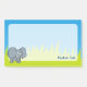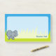 Cute gray baby elephant cartoon on grass and sky background. Custom text.