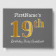 This guest book design features the ordinal number "19th" with a faux/imitation gold-like appearance. It also features a customized name, and a gray (grey) colored background. It could be used at a birthday party for somebody who is celebrating their nineteenth birthday. [~Z0000193]