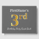 This guest book design features the ordinal number "3rd" with a faux/imitation gold-like appearance. It also features a personalized name, and a gray (grey) colored background. It could be used at a birthday party for somebody who is celebrating their third birthday. [~Z0000193]