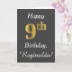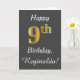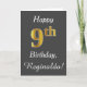 This simple birthday card design features the message "Happy 9th Birthday", with the "9th" having a faux gold-like appearance. It also features a custom name, and a gray background. It could be given to somebody who is celebrating their ninth birthday.