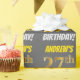This wrapping paper design features a message like "ANDREW’S 27th BIRTHDAY!", with the "27th" having a faux/imitation gold-like color appearance, and with the name and "BIRTHDAY" in a fun, bold font. The name can be personalized, and the background is colored gray (grey). Wrapping paper like this could perhaps be used when wrapping birthday gifts being given to somebody in celebration of their twenty seventh birthday. [~Z0000211]