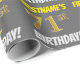 This wrapping paper design features a message like "FIRSTNAME’S 71st BIRTHDAY!", with the "71st" having a faux/imitation gold-like color appearance, and with the name and "BIRTHDAY" in a fun, bold font. The name can be personalized, and the background is colored gray (grey). Wrapping paper like this could perhaps be used when wrapping birthday gifts being given to somebody in celebration of their seventy first birthday. [~Z0000211]