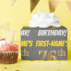 This wrapping paper design features a message like "FIRST-NAME’S 76th BIRTHDAY!", with the "76th" having a faux/imitation gold-like color appearance, and with the name and "BIRTHDAY" in a fun, bold font. The name can be customized, and the background is colored gray (grey). Wrapping paper like this could perhaps be used when wrapping birthday gifts being given to somebody in celebration of their seventy sixth birthday. [~Z0000211]