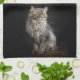 Calmly sitting a full grown fluffy gray cat. Looks like a bit of tabby stripes lightly go through fur.