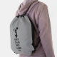 Fun cheerleader's drawstring backpack done in gray, with a black silhouette of a cheerleader and black text reading KEEP CALM AND CHEER ON. Personalize the text to read what you want. More colors available.