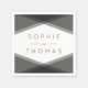 This modern wedding napkin has a gray layered geometric design featuring the names of the wedding couple.