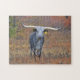 This pretty animal puzzle features my original photograph of a pretty Longhorn cow in a wild part of a Texas pasture. Its coloring is in many shades of gray for an unusual looking spotted cow.