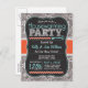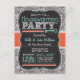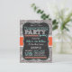 We've moved! Help us celebrate our new home! Cute retro chalkboard look housewarming party invitation on warm gray paisley country pattern with orange and teal green colors. Vintage feel chalk fonts on cool blackboard background with vintage skeleton key and ric rac design elements.