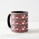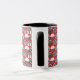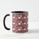 This mug has a geometric design of ovals with different patterns in gray in each half all on a field of red.