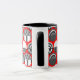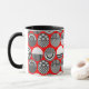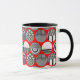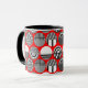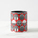 This mug has a geometric design of ovals with different patterns in gray in each half all on a field of red.