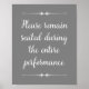This charming gray poster features the phrase "Please remain seated during the entire performance" in a handwritten white font and accented on top and bottom. This is a humorous way to decorate a bathroom or washroom.