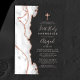 The left-hand edge of this elegant modern first communion invitation features a gray and white watercolor agate border trimmed with faux rose gold glitter. A faux rose gold foil cross appears above the customizable text, which combines pale pink handwriting script, copperplate and italic fonts on your choice of a clear or frosted background.