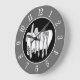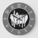 An elegant dining clock with a set of silverware on a white embellished table napkin in shades of gray on a black inner circle, with white numbers on a dark gray background. Customize It to add your name or restaurant, change background colors, even save your designs for later.