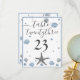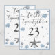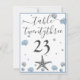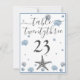 Gray Starfish Blue Shells Beach Wedding Table Number Card. Two hearts in the sand, dark blue background