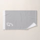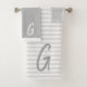Handsome bath towel set done in gray and white featuring stripes, on the bath towel and a big gray one letter monogram. The wash cloth is done in a gray and white damask pattern and the hand towel is gray with a white band, on one side and a white single letter monogram. Personalize the letter to suit your needs.