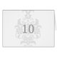 Simple with chic elegance describes this sophisticated Subtle Damask Wedding Table Number Card with a light gray damask flourish background. This classy table card is perfect for a traditional wedding and can be easily customized with a table number(s) or your wedding details. For more customization options, click on the Customize It button.
