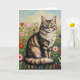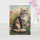 Gray striped cat sitting in a patch of colorful folk art flowers. Cute gray striped cat birthday card for cat lovers.
