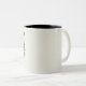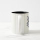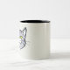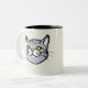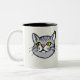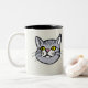 Simple two-tone mug with drawing of a gray tabby cat’s head with whiskers, gray gray silver striped striped hair fur, pink nose, white inside the ears, and golden yellow amber eyes.
