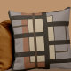 Modern throw pillow features a gray taupe and dark brown geometric pattern with beige and sienna orange accents. This modern abstract geometric design is build on combinations of repeated rectangles, which are overlapped and interlaced to form an interesting artistic pattern.
