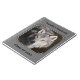 Face of a grey timber wolf with bright orange eyes. Realistic artwork created from an original oil painting by equine and wildlife artist Crista S. Forest.