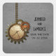 These unique Vintage Clock Save the Date Stickers in light gray feature antique steampunk clocks and gears hanging by a metal bead chain. The background has a textured paper and mesh overlay which adds a distressed and grungy feel to the design. These quirky and offbeat save the date stickers would be perfect for your steampunk inspired wedding. Easy to customize, simply add your wedding details. Click on the "Customize It" button to find additional personalization options.