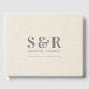 This elegant Gust Book features a light beige linen texture background with a simple gay wedding monogram.
