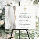 The left-hand edge of this elegant welcome sign features a gray and white watercolor agate border trimmed with faux gold glitter. A faux gold foil cross appears above the customizable text, which combines handwriting, copperplate and italic fonts in charcoal gray on a white background. Personalize it with the name of the guest of honor and the date.