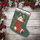 This Holiday stocking has an image of an adorable gray and white cat peeking out of an ornate red stocking. The image is surrounded by holly, red berries, and poinsettia blooms, and is placed on a Christmas green background. A white scalloped edge design bordered in red holds your customized name at the top. The back of the stocking is identical to the front.
