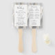 These fans were exactly as pictured. The quality is great. Perfect favor for a wedding!...I will make assembly a little easier by using a hot glue gun and finish them off with a ribbon. Beautifully printed. Crisp and clear text.