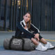 Minimalistic gym duffel bag design featuring minimalistic customizable name in white and gray.