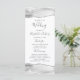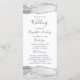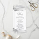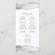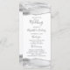 This elegant, modern wedding program features gray and white watercolor agate top and bottom borders trimmed with silver faux glitter. The text appears in elegant charcoal gray handwriting and copperplate fonts on a white background.
