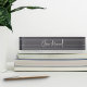 Elegant desk nameplate features your name, title, or choice of personalization in modern white hand scripted cursive lettering on a neutral gray background.
