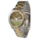 Gold and silver watch featuring an Elk couple graze a field on a chilly autumn fall season morning with some lingering fog. The large bull elk eats some grass while the female cow elk looks on. This is in Boxley Valley, Arkansas, USA.