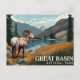 Striking vintage-style travel poster illustration featuring a Bighorn Sheep standing by an alpine lake, with rugged mountains and snow-capped peaks in the background, labeled "Great Basin National Park." Captures the high-desert and mountain wilderness of the Nevada park. Excellent for wildlife lovers, hikers, Nevada visitors, and collectors of WPA-style national park posters.