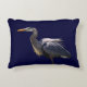 This decorative accent pillow features the Great Blue Heron, a large wading bird in the heron family Ardeidae, common near the shores of open water and in wetlands. He is the largest North American heron. Notable features include slaty flight feathers, red-brown thighs, and a paired red-brown and black stripe up the flanks; the neck is rusty-gray, with black and white streaking down the front; the head is paler, with a nearly white face, and a pair of black plumes running from just above the eye to the back of the head. The feathers on the lower neck are long and plume-like. Because this is the breeding season, he also has plumes on the lower back and an orange bill. His feathers are backlit by the luminous sunlight.