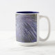 The great blue heron, in the original photograph by ZoeSPEAK on this two-tone Mug, is showing his plumage, looking a bit like a porcupine, fluffing up his feathers to make himself look bigger, to tell another bird that it's his territory. In the photo we see the bird in profile, his gray blue coloring ending in a white head with deep blue bands on each side. His long yellow beak is pointing straight ahead as he walks forward with his long, curved neck tucked back against his body. The background of grasses is in muted earth tones with bits of green throughout. The photo wraps around the mug.