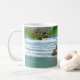 A beautiful scene of a great blue heron on the shoreline on these awesome coffee mugs.