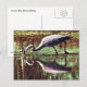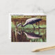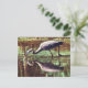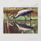 This postcard features the Great Blue Heron, a large wading bird in the heron family Ardeidae, common near the shores of open water and in wetlands. He is the largest North American heron. Notable features include flight feathers, red-brown thighs, and a paired red-brown and black stripe up the flanks; the neck is rusty-gray, with black and white streaking down the front; the head is paler, with a nearly white face, and a pair of black plumes running from just above the eye to the back of the head. The feathers on the lower neck are long and plume-like. Because this is the breeding season, he also has plumes on the lower back and an orange bill. He is standing in a shallow creek dipping his beak into the water hoping to snag a fish or frog. The bright sunny day light creates a wonderful mirror image reflection.