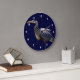 This clock features the Great Blue Heron, a large wading bird in the heron family Ardeidae, common near the shores of open water and in wetlands. He is the largest North American heron. Notable features include slaty flight feathers, red-brown thighs, and a paired red-brown and black stripe up the flanks; the neck is rusty-gray, with black and white streaking down the front; the head is paler, with a nearly white face, and a pair of black plumes running from just above the eye to the back of the head. The feathers on the lower neck are long and plume-like. Because this is the breeding season, he also has plumes on the lower back and an orange bill. His feathers are backlit by the luminous sunlight.