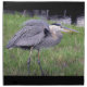 In the original photograph by ZoeSPEAK on this Cloth Napkin, the great blue heron, standing along the bank of a canal, sees something farther up the waterway, a possible threat to his territory. He puffs up the bluish gray feathers on his back to make himself look bigger. With his long, thin legs spread as he looks straight ahead, the bird is ready to defend his space in the green grass. Dark, rippled reflections on the water form the background of the scene. The napkin is bordered by black bands at the top and bottom, but the color can be changed to another if you prefer. The napkins come in two sizes, dinner (shown) and cocktail.