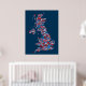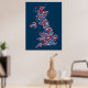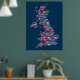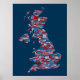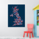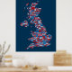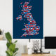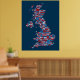 A typographic text map of Great Britain showing over 400 cities and towns within the United Kingdom, red, white and blue text on a blue background.