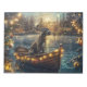 Set sail into the magic of the holiday season with this beautifully detailed illustration, showcasing a proud dog sitting in a festively decorated boat, gliding across a serene Christmas lake. The twinkling lights from nearby pine trees reflect off the water, casting a warm, festive glow that enhances the cozy ambiance. Ornaments dangle from the boat's sides, while glowing lanterns light the way, creating a scene that captures the true essence of Christmas warmth and joy. This nostalgic artwork brings a touch of holiday magic to any space, perfect for those who cherish the spirit of the season.