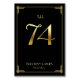 Great Gatsby Art Deco wedding table number cards with golden number 74 and changeable text, where you can add your names and wedding date, printed on black background