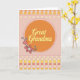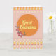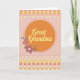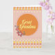 This card features a large orange circle centered on a soft blush pink background, creating a cozy, affectionate look ❤️. Inside the circle, the words “Great Grandma” sit prominently in flowing yellow lettering, giving the message a gentle, celebratory glow. A muted red dotted line traces around the circle like a delicate frame, adding texture without crowding the center. At the lower-left edge of the circle, two coral-pink flowers with black outlines lean toward the message, as if offering a small bouquet in friendship and love 🌼. Curving tendrils and little leaf-like curls extend from the blossoms and drift slightly onto the pink background, softening the edges with an intimate, caring touch. Across the top, a decorative band shows golden-yellow squares mixed with small orange circles and pale yellow dots, arranged in a tidy, rhythmic pattern. Along the bottom, a second border forms a lively grid of yellow squares, coral rectangles, and bright yellow polka dots. The floral cluster sits at the lower-left of the orange circle, with the dotted outline encircling it and the geometric borders running straight across the top and bottom.
