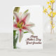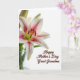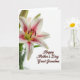 Designed with a single large lily taking over the left side, this card pairs soft beauty with a quiet, affectionate tone ❤️. The flower’s white petals open wide with fuchsia-pink streaks and tiny speckles, drawing your eye toward the detailed center. A fresh green pistil sits in the middle, ringed by darker anthers dusted with pollen, adding texture against the smooth petals. Behind the main bloom, a couple of closed buds lean in close, like a gentle companion waiting its turn. Near the lower left, slim green stems rise from a lightly tinted glass vase, anchoring the arrangement without crowding it. On the lower right, the message “Happy Mother’s Day Great Grandma” appears in flowing cursive-style lettering in a warm brown tone, leaving plenty of open space around it 🌼. The bright white background and soft lighting make the petals look slightly translucent, with faint shadows falling to the right of the bloom.